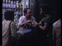 Two men are standing close to each other, engaged in a conversation. One man has dark, curly hair and a mustache, wearing a light blue shirt over a colorful t-shirt. The other man has short, graying hair and is dressed in a light-colored shirt. The background appears to be indoors, with dim lighting and wooden structures visible.